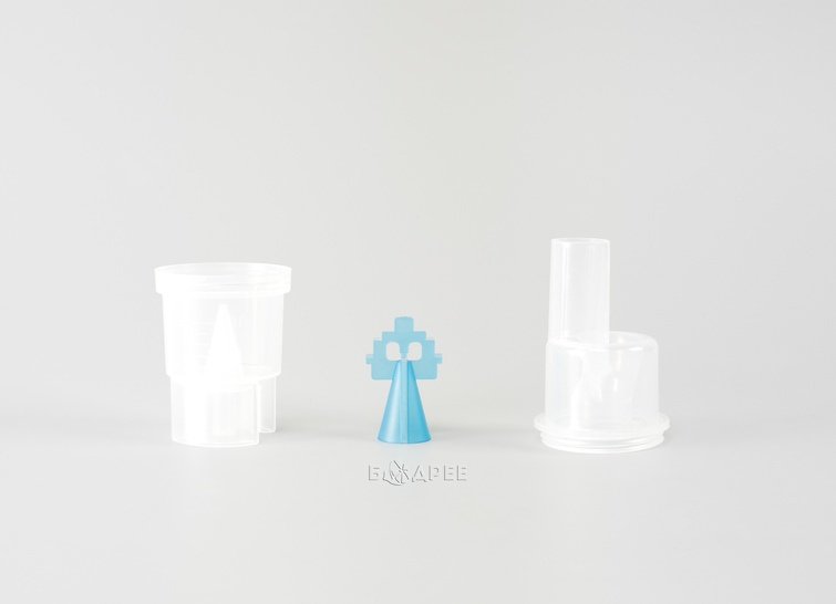 3. Установите необходимый распылитель. В заводской комплектации внутри небулайзера установлен распылитель «В» синего цвета, который эффективен для воздействия на весь дыхательный тракт. Для более эффективного воздействия лекарственных средств на верхние дыхательные пути установите, вместо синего распылителя, распылитель «С» красного цвета. Для более эффективного воздействия на нижние дыхательные пути – распылитель «А» желтого цвета, который состоит из двух частей.