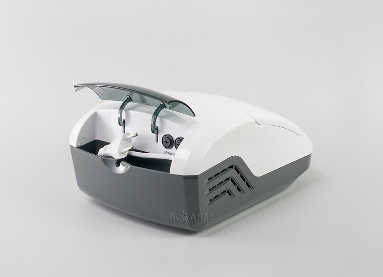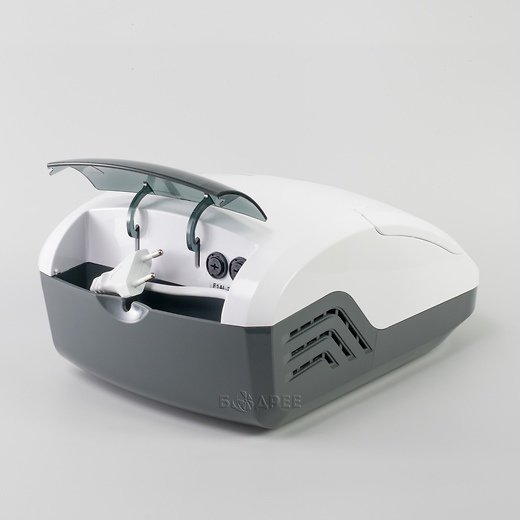 Дизайн. Прибор настолько компактен, что легко поместится на полке даже в маленьком шкафу. Корпус выполняет роль кейса для хранения - все комплектующие можно убрать внутрь и закрыть крышкой до следующего использования. Для удобства перевозки и сборки предусмотрена ручка.